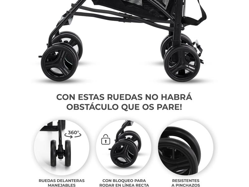 🛞 Ruedas Resistentes: Espuma antipinchazos y giro 360° con bloqueo, ideales para terrenos irregulares.